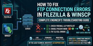 FTP connection errors occur when the client fails to establish a stable communication channel with the server due to firewall restrictions, incorrect credentials, TLS mismatches, or passive mode misconfigurations. These issues typically appear as errors like “Connection Timed Out,” “530 Login Incorrect,” or “Failed to Retrieve Directory Listing.” Engineers resolve these problems by verifying port accessibility, enabling passive mode, configuring firewall rules, and ensuring encryption compatibility between client and server.