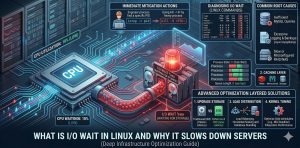 I/O Wait in Linux occurs when the CPU stays idle while waiting for disk or network I/O operations to complete. A server shows low CPU usage during high I/O wait because the processor waits for data from storage instead of executing tasks. This condition causes slow application performance, delayed responses, and bottlenecks even on high-spec servers. Engineers must optimize disk I/O, storage latency, and query behavior to fix this issue in Linux server management services environments.